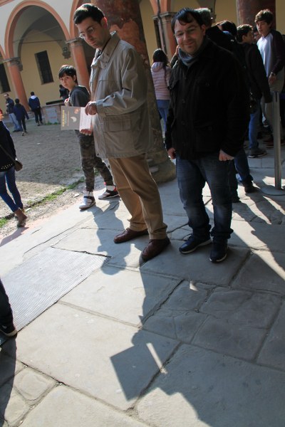 Alle 10.33, orario in cui l’eclissi solare ha raggiunto il suo punto massimo nel capoluogo emiliano, intorno al 65% circa, ci dicono gli astronomi presenti, il Quadriportico di vicolo Bolognetti è gremito di gente. Si sgomita per riuscire a trovare un posto da cui poter alzare gli occhi al cielo e vedere questo fenomeno celeste attrezzati di occhialini appositi, pellicole di rullini, vecchie lastre dei raggi e, per i più creativi, fogli bucati o pellicole con cui proiettare il sole su una superficie come il pavimento o la parete di una scatola.