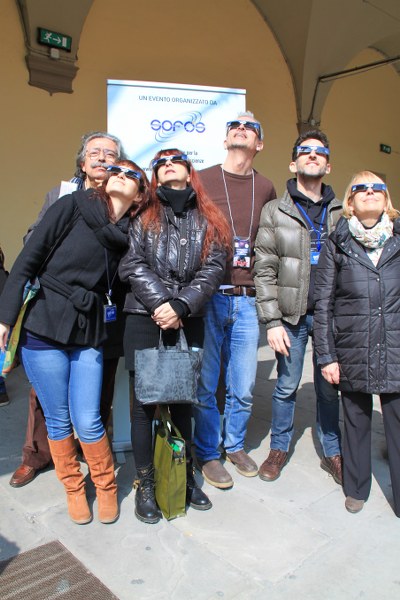 Bologna, 20 mar. – Giardini, piazze, cortili delle scuole affollati per osservare l’eclissi, a Bologna come in tutta Italia. Noi eravamo in vicolo Bolognetti, dove a organizzare l’iniziativa c’era Sofos, associazione per la divulgazione delle scienze.