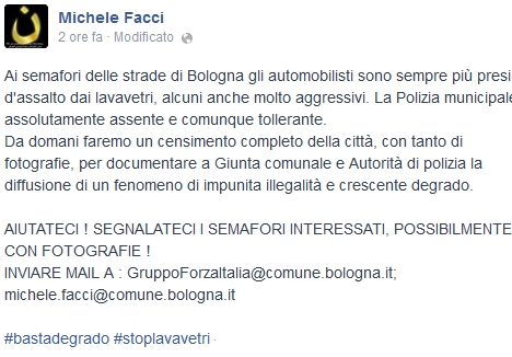 “Ai semafori delle strade di Bologna gli automobilisti sono sempre più presi d’assalto dai lavavetri – scrive Facci- alcuni anche molto aggressivi. La Polizia municipale è assolutamente assente e comunque tollerante”. Da domani sabato 30 agosto, rende noto il capogruppo di Forza Italia a Palazzo D’Accursio, “faremo un censimento completo della città, con tanto di fotografie, per documentare alla Giunta comunale e alle autorità di polizia la diffusione di un fenomeno di impunita illegalità e crescente degrado”.