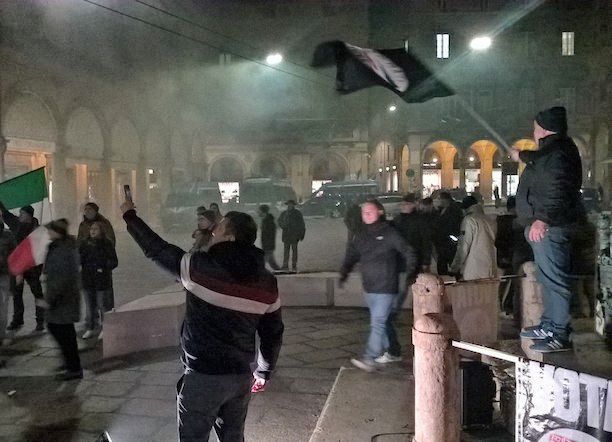 Infine, anche il presidio antifascista indetto dai centri sociali per le 18.30, trasformatosi nel corso di un’ora in un corteo, è stato caricato dalle forze dell’ordine. A pochi minuti dall’inizio previsto per il comizio dei forzanovisti, oltre un migliaio di persone raccolte in Piazza Maggiore angolo via dell’Archiginnasio hanno fatto dietrofront e hanno sfilato nel centro città, attraversando piazza Santo Stefano e via Farini, fino a raggiungere piazza Cavour. Qui la carica delle forze dell’ordine in assetto antisommossa, con manganelli, idranti e lacrimogeni, arrivata pochi istanti dopo il contatto con le prime file del corteo. Dall’altro lato i manifestanti hanno risposto lanciando bottiglie e petardi. Liberata la via principale e fatti retrocedere i manifestanti, un gruppo di una trentina di ragazzi e ragazze si è seduto tra la testa del corteo e il blocco delle forze dell’ordine, dando così vita ad un sit-in non violento.