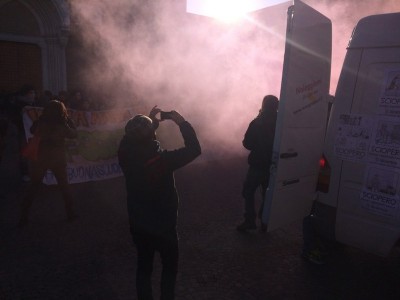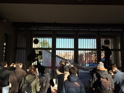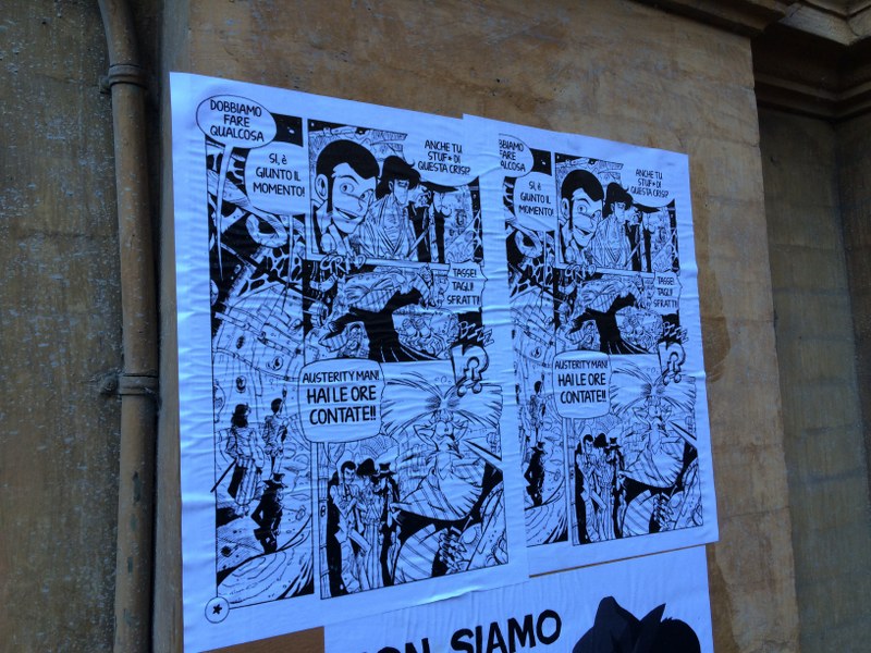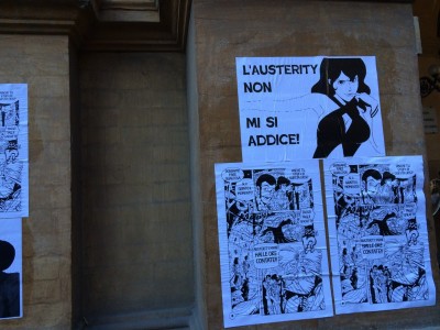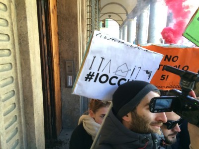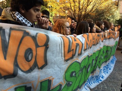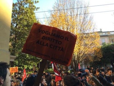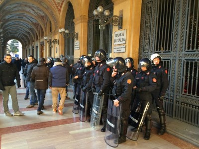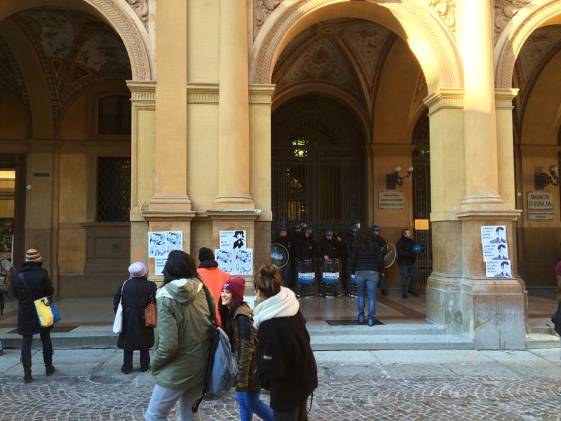 Durante la marcia, diverse ‘azioni’. La prima contro Bankitalia: coperti da tute bianche, un paio di attivisti del collettivo LàBas ha incollato manifesti contro le colonne della sede di piazza Cavour. “Avremmo voluto mettere lucchetti di cartone davanti alle cancellate, ma loro si sono nascosti dietro la polizia” dicono dal microfono dell’impianto audio montato su di un furgone. A proteggere l’ingresso c’erano schierate due squadre di Polizia e Carabinieri in tenuta antisommossa.