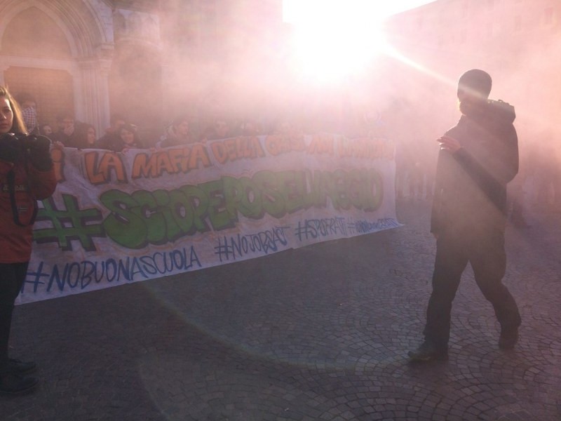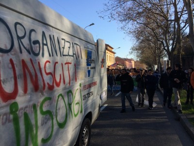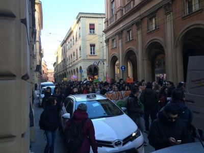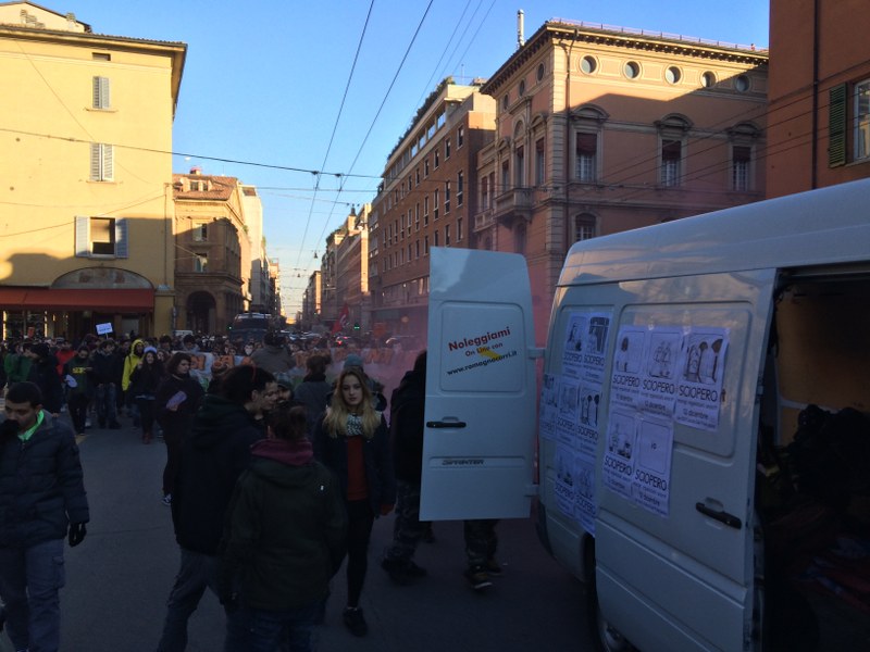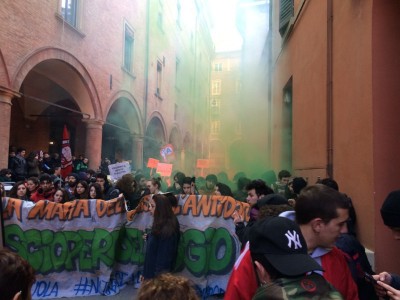 Bologna, 12 dic. – Secchi di letame e fumogeni: sono le ‘armi’ portate in piazza questa mattina dai collettivi Hobo e LàBas che hanno sfilato contro Jobs act e politiche del Governo Renzi. Circa 200 persone, in larghissima parte studenti medi, hanno sfilato per il centro da piazza San Francesco a Piazza Verdi senza mai incontrare i cortei della Cgil. “Siamo noi la piazza alternativa” hanno gridato a più riprese.