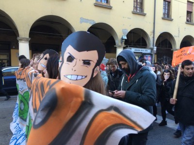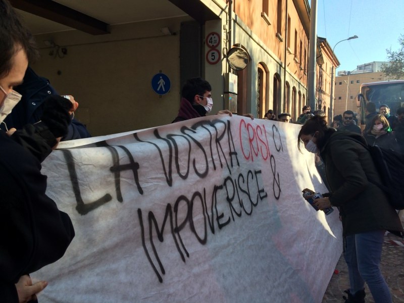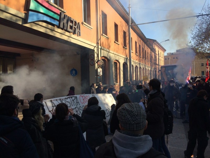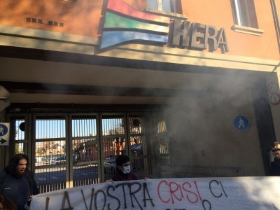 Ripartito, il corteo riprende a sfilare su via Zamboni, arriva a porta San Donato e prende i viali in direzione Porta Mascarella. Davanti alla sede di Hera, gli attivisti di Hobo e Idra indossano mascherine e appendono uno striscione per protestare contro la multiutility e ‘l’interramento di rifiuti tossici’.