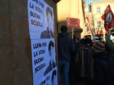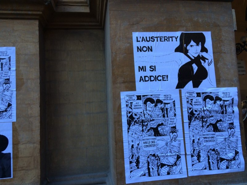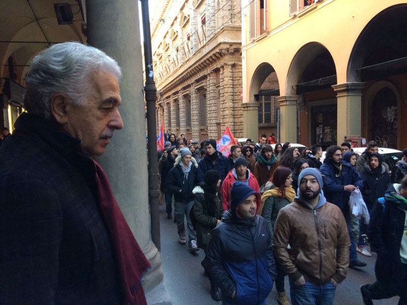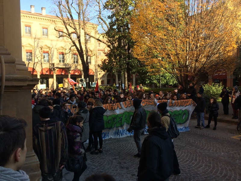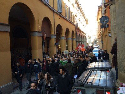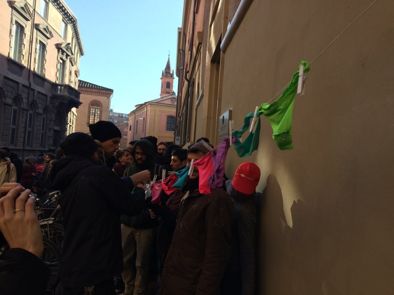 ‘Inversione a U’ e i 200 prendono via Urbana e, dopo piazza Aldrovandi, attraversano la zona Universitaria: davanti all’Ufficio Relazioni con il Pubblico dell’Università, all’incrocio tra via Belmeloro e via Zamboni, gli attivisti di Hobo hanno incollato alcuni manifesti con la scritta ‘Io non lavoro gratis’ mentre quelli di LàBas hanno appeso mutande su di un improvvisato filo da stendere.