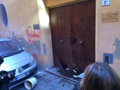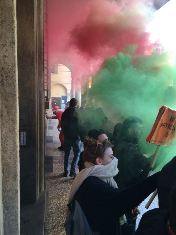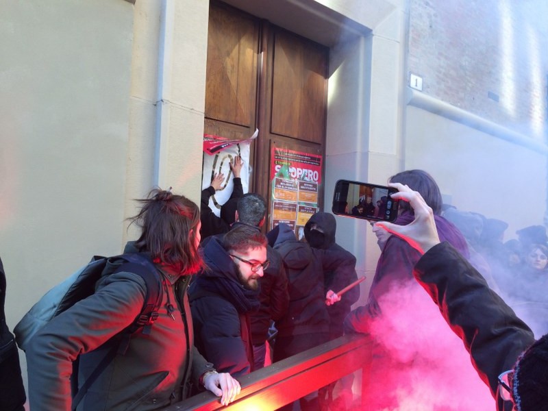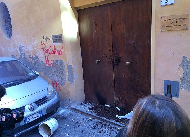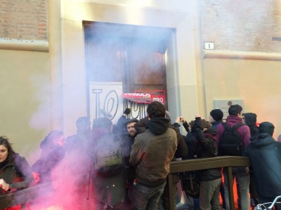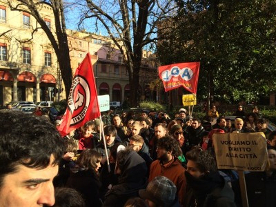 Il corteo è poi ripartito verso piazza Minghetti e, superata la piazza, ha voltato in via Castiglione e poi in vicolo De’ Chiari. Lì la seconda azione: in vicolo Monticelli si trova l’ufficio notifiche Esecuzioni e Protesti della Corte d’Appello di Bologna. Anche lì, contro gli uffici da cui partono gli ufficiali giudiziari per l’esecuzione degli sfratti, gli attivisti di Làbas, coperti da una densa cortina di fumogeni, hanno lanciato due secchiate di letame. “Basta sfratti” hanno gridato.