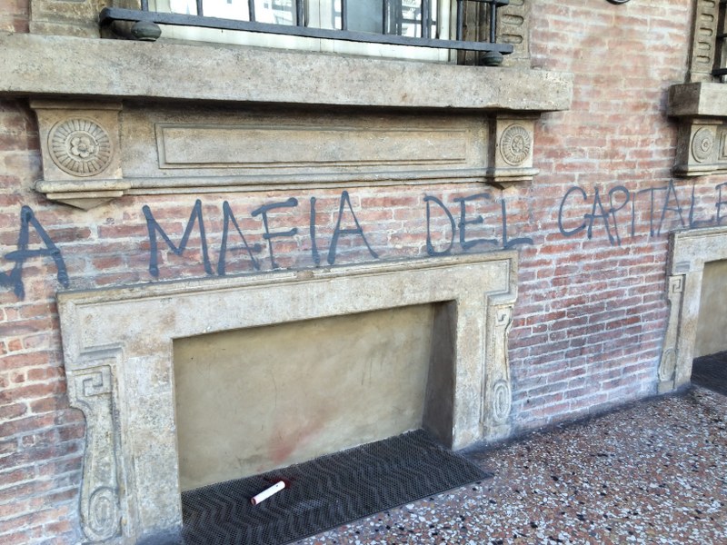 Ripartito verso via Cartolerie, il corteo ‘selvaggio‘ è arrivato in via Santo Stefano. Prima però, come sul palco di San Remo, un cambio d’abito: abbandonate le tute bianche in via De’ Chiari, sono spuntate alcune divise rosse da Babbo Natale. Davanti alla sede del Nuovo Centro Destra rispuntano i fumogeni, i secchi di letame e Babbo Natale che con una bomboletta scrive sul muro “La mafia del capitale”.