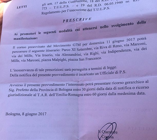 Si legge sulla comunicazione firmata dal questore Coccia: “Considerato che il percorso individuato dalla manifestazione interessa tratti che nelle giornata del fine settimana sono preclusi alla circolazione veicolare nell’area del cosiddetto T-days, attualmente delimitato da barriere fisiche poste all’altezza di via Indipendenza angolo via Augusto Righi, via Ugo Bassi altezza via Cesare Battisti, e a chiusura di via Rizzoli; tenuto conto che nei suddetti tratti di strade cittadine ordinariamente si registra in un pomeriggio festivo una notevole concentrazione di persone, valutata la necessità di assicurare la mobilità e la libertà di circolazione delle persone, nonché la fruibilità di esercizi commerciale nelle vie interessante, attesta pertanto l’esigenza di contemperare il diritto a manifestare e a esprimere il dissenso con l’esercizio dei predetti diritti, tutti costituzionalmente previsti e tutelati”. Nella comunicazione del questore si cita inoltre la necessità di tutelare “l’ordine, la sicurezza, la quiete pubblica”. Da qui la decisione di vietare il passaggio del corteo per via Ugo Bassi e in parte di via Indipendenza. La prescrizione del questore indica al corteo infatti una deviazione. Solo la primissima parte di via Indipendenza potrà essere percorso dai manifestanti, che saranno poi indirizzati lungo via dei Mille e via Marconi.