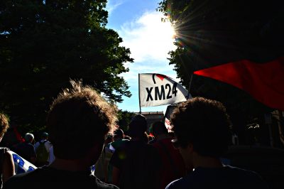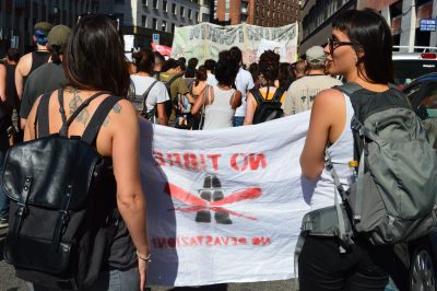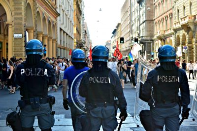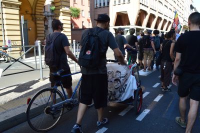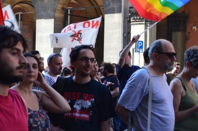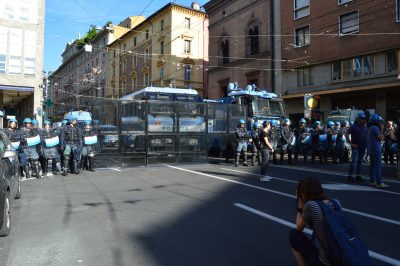 “Non state difendendo nulla, non servite a nulla e vi paghiamo noi”, ha urlato un organizzatore dal microfono rivolgendosi agli agenti che hanno seguito passo passo il corteo, praticamente circondandolo da ogni lato. Un dispositivo di sicurezza sproporzionato rispetto ai numeri messi in campo dai manifestanti e agli annunci degli organizzatori che hanno più volte annunciato un corteo “pacifico, colorato e festoso”. Se la manifestazione non ha violato il centro città a farlo sono stati una manciata di attivisti, riusciti ad arrivare fino in Piazza Maggiore. Lì hanno srotolato uno striscione e sono stati poi portati via di forza dagli agenti presenti.