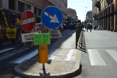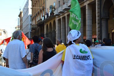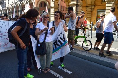 Bologna, 11 giu. – Hanno sfilato in mille per le vie del centro di Bologna sotto un sole cocente. Attivisti, militanti dei centri sociali, associazioni ambientaliste come Legambiente e Greepeace. Ma si sono viste anche le bandiere di Arci, Sinistra Italiana e tanti striscioni dei comitati che in tutta Italia, ognuno nel suo territorio, lottano contro le grandi opere. Il Tav in Valsusa, il gasdotto Tap che approderà in Puglia, i gruppi che si oppongono a nuove autostrade o all’ampliamento di quelle vecchie. Tra di loro anche i bolognesissimi no-passante. Un corteo, quello del “G7m – Ambiente alla base non al vertice“, colorato e festoso. E scortato da una forza ingente di poliziotti e carabinieri.