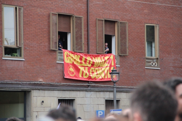 Da un appartamento che affaccia sulla piazza viene calato uno striscione firmato da la “Peste rossa”, ironico collettivo che ha scelto una zecca come simbolo: “Grillo vale uno, tu vali zero”. Qualche fischio, qualche dito medio che si leva condito da qualche insulto. Nulla di più.