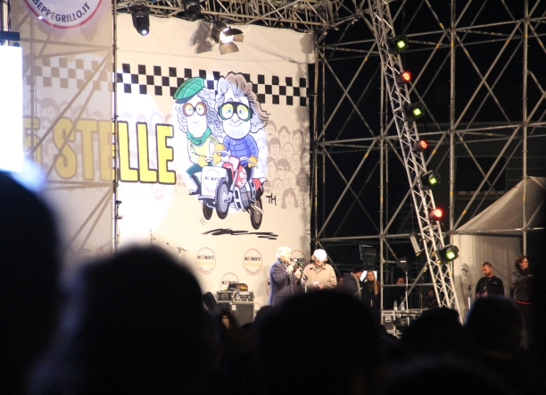 Con la sua tipica dose di lucida visionarietà, Grillo parla a braccio, elogia il “pessimismo che muove all’azione”, racconta di un futuro in cui il lavoro salariato non esisterà più e spiega che la soluzione è il reddito di cittadinanza, parla di energia pulita, di città da cui si fugge “perché fanno schifo”, e via dicendo. Non si esime, sempre con ironia, di bacchettare i suoi: qualche buffetto ai meet up che vorrebbero poter usare il logo e che il duo non vuole concedere (e infatti il gazebo dei meet up, i primi nuclei del movimento, sono relegati alla periferia della kermesse); e anche al rampante Di Maio viene ricordato a chi deve il proprio successo: “Quando abbiamo preso Di Maio in provincia di Napoli parlava come un Bassolino qualsiasi”.