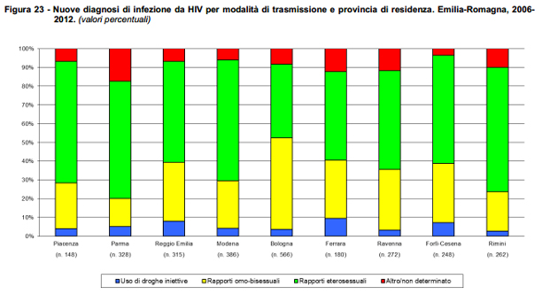 In Emilia Romagna le segnalazioni (tra il 2006 e il 2012) che riportano come modalità di trasmissione rapporti omo-bisessuali non protetti sono in totale 834, di cui solo 9 riguardano persone di sesso femminile. Sono 272 i casi nella provincia di Bologna.