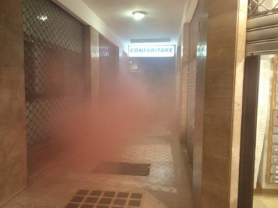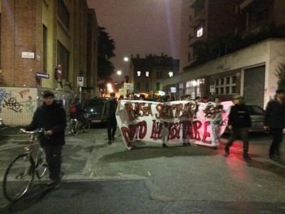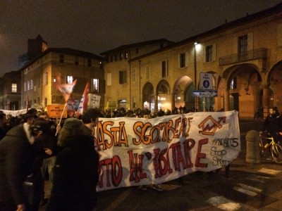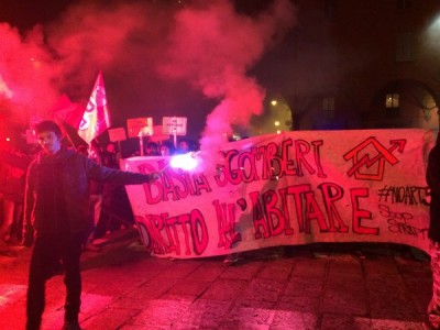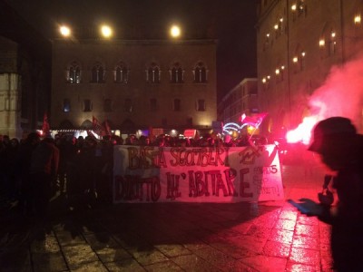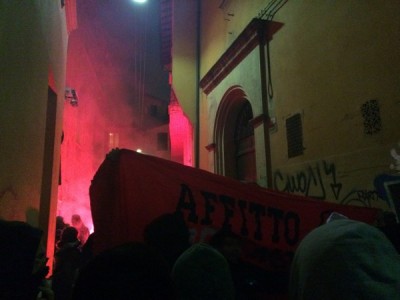 L’occupazione è arrivata al termine di un corteo partito da piazza Verdi intorno alle 18,30. In duecento persone, in larghissima parte attivisti dei collettivi Hobo, LàBas e di Asia Usb, hanno sfilato per via delle Moline, via de’ Falegnami, via Marconi (al grido di “Tutti quanti famo paura”), via Ugo Bassi, piazza Roosevelt, via IV Novembre, piazza Maggiore, via Indipendenza per finire poi nelle stradine medievali alle spalle del ghetto ebraico. All’incrocio con via Lame una prima azione degli attivisti di LàBas: coperti da una fitta cortina di fumogeni un manipolo di manifestanti si è diretto verso la sede di Confabitare, l’associazione di proprietari immobiliari guidata da Alberto Zanni che nelle scorse settimane ha chiesto a più riprese il pugno duro contro le occupazioni. “Abbiamo sanzionato la sede di Confabitare” hanno gridato dall’impianto audio trasportato su di un carriolo in testa al corteo. La “sanzione” è una scritta a vernice rossa sulla serranda abbassata dell’associazione: “Occupare è giusto“.