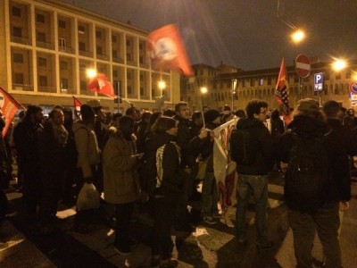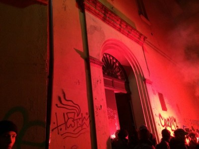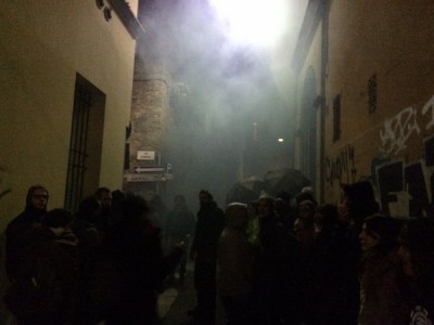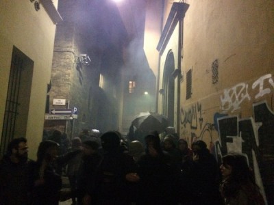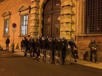 Ripartito, il corteo è sfilato sotto la Prefettura al grido di “questo palazzo non serve a un cazzo, Merola, Merola sei un pupazzo” e poi, dopo un brevissimo stop davanti al portone chiuso di Palazzo d’Accursio, ha imboccato via Indipendenza. Qui, all’altezza di via del Monte, prendendo di sorpresa Digos e Polizia Municipale che si trovavano davanti al corteo, i manifestanti si sono infilati in via del Monte e rapidi hanno guadagnato piazzetta Prendiparte. Mentre un gruppo, con l’ausilio di ombrelli e striscioni, impediva a cronisti e fotografi di riprendere la scena, un altro gruppo armato di attrezzi da carpentiere ha avuto la meglio del portone all’1 di via Albiroli. Che fosse un palazzo di proprietà ecclesiale era chiaro dalla lunetta di ferro che sormontava il portone, con il cristogramma JHS. “E’ una struttura appartenente alla Chiesa- ha detto Page- che come sappiamo ha un regime immobiliare a sé stante e questo ha rafforzato ancora di più la nostra volontà di dimostrare che la speculazione a Bologna e coinvolge tutti i poteri, dal Comune fino ad arrivare alla Chiesa”.