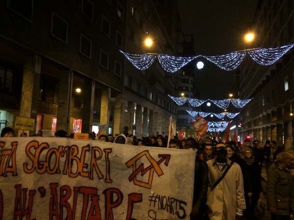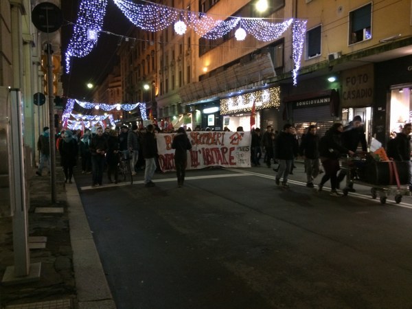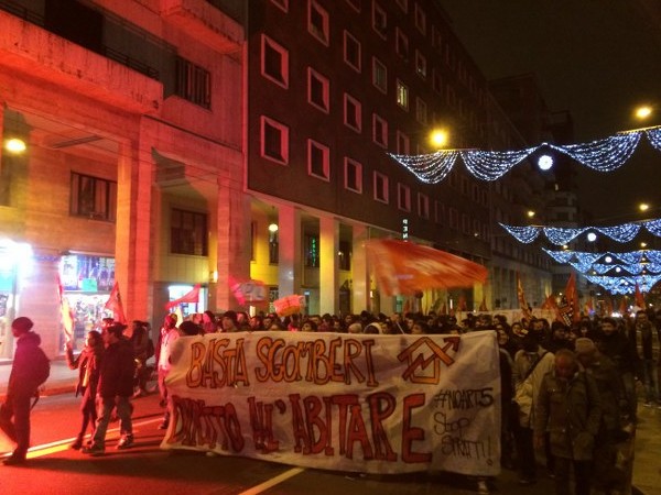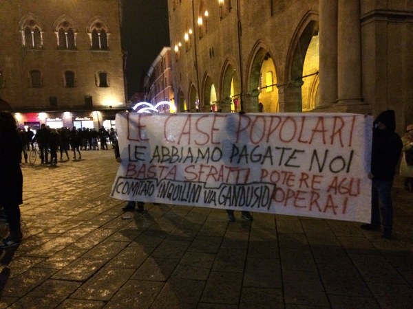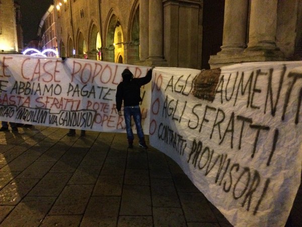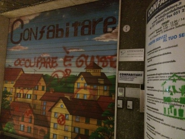 L’occupazione è arrivata al termine di un corteo partito da piazza Verdi intorno alle 18,30. In duecento persone, in larghissima parte attivisti dei collettivi Hobo, LàBas e di Asia Usb, hanno sfilato per via delle Moline, via de’ Falegnami, via Marconi (al grido di “Tutti quanti famo paura”), via Ugo Bassi, piazza Roosevelt, via IV Novembre, piazza Maggiore, via Indipendenza per finire poi nelle stradine medievali alle spalle del ghetto ebraico. All’incrocio con via Lame una prima azione degli attivisti di LàBas: coperti da una fitta cortina di fumogeni un manipolo di manifestanti si è diretto verso la sede di Confabitare, l’associazione di proprietari immobiliari guidata da Alberto Zanni che nelle scorse settimane ha chiesto a più riprese il pugno duro contro le occupazioni. “Abbiamo sanzionato la sede di Confabitare” hanno gridato dall’impianto audio trasportato su di un carriolo in testa al corteo. La “sanzione” è una scritta a vernice rossa sulla serranda abbassata dell’associazione: “Occupare è giusto“.