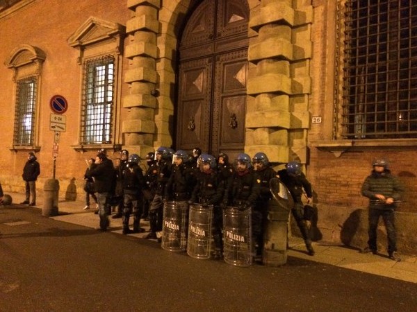 Ripartito, il corteo è sfilato sotto la Prefettura al grido di “questo palazzo non serve a un cazzo, Merola, Merola sei un pupazzo” e poi, dopo un brevissimo stop davanti al portone chiuso di Palazzo d’Accursio, ha imboccato via Indipendenza. Qui, all’altezza di via del Monte, prendendo di sorpresa Digos e Polizia Municipale che si trovavano davanti al corteo, i manifestanti si sono infilati in via del Monte e rapidi hanno guadagnato piazzetta Prendiparte. Mentre un gruppo, con l’ausilio di ombrelli e striscioni, impediva a cronisti e fotografi di riprendere la scena, un altro gruppo armato di attrezzi da carpentiere ha avuto la meglio del portone all’1 di via Albiroli. Che fosse un palazzo di proprietà ecclesiale era chiaro dalla lunetta di ferro che sormontava il portone, con il cristogramma JHS. “E’ una struttura appartenente alla Chiesa- ha detto Page- che come sappiamo ha un regime immobiliare a sé stante e questo ha rafforzato ancora di più la nostra volontà di dimostrare che la speculazione a Bologna e coinvolge tutti i poteri, dal Comune fino ad arrivare alla Chiesa”.
