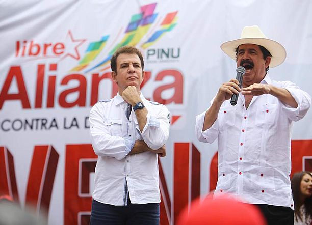 Nella foto: il candidato Nasralla con l’ex presidente Zelaya, coordinatore della Alleanza d’Opposizione contro la Dittatura in Honduras.