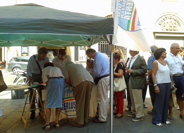 Il gazebo di oggi, spiega Bignami, è “per chi non è riuscito a partecipare alla manifestazione di ieri a Roma“. Alle 12.45 Bignami prenderà un treno verso la Capitale, portando nella sede del Pdl in via dell’Umiltà tutte le firme raccolte in mattinata a Bologna.