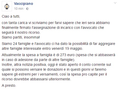 “Ribadiremo che non siamo un gruppo NoVax, che non ha assolutamente senso incentivare un dibattito polarizzato e lo faremo anche sull’onda di alcuni medici e ricercatori fuori dagli schieramenti che in queste settimane hanno iniziato a parlare, a porre delle domande interessanti, a mettere in discussione la questione dell’obbligo”. Queste le parole di Marcandalli, che fanno riferimento al Presidente Silvio Garattini, a Maurizio Bonati dell’Istituto di Ricerche Farmacologiche “Mario Negri” di Milano e il dottor Giancarlo Pizza, presidente dell’Ordine dei medici. Nel frattempo, sulla pagina Facebook del comitato compare un post per comunicare che ieri sera è stata firmata l’assegnazione di incarico con l’avvocato che seguirà il ricorso.