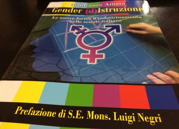 Nelle vicinanze della porta della chiesa, durante il convegno, collaboratori di Amato allestiscono un lungo tavolo con sopra decine di copie di “Gender (d)Istruzione. Le nuove forme d’indottrinamento nelle scuole italiane“, il libro scritto dal presidente dei Giuristi per la Vita. Il libello raccoglie gli scritti, le riflessioni, gli editoriali del poliedrico avvocato uniti ad alcuni “casi” commentati delle “vere e proprie persecuzioni” subite dai novelli martiri immolatisi nella lotta contro il genderismo. Il tutto teso a dimostrare la tesi che vi è in atto un’azione coordinata da parte di una piccola lobby gay, ricca e potente, interessata a ribaltare la società. A scriverne la prefazione è Monsignor Luigi Negri, il Vescovo di Ferrara, quello che qualche estate fa aveva parlato di “orge davanti al duomo“.