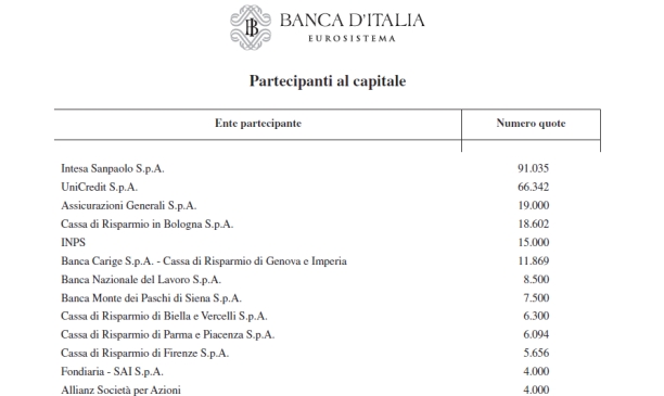 Oltre all’abolizione della seconda rata dell’Imu 2013 si è deciso di rivalutare le quote che le banche detengono nell’istituto di Palazzo Coch. Il vecchio valore fu fissato nel 1936 a 300 milioni di lire, oggi 156mila euro. Una cifra suddivisa tra i vari istituti di credito che formalmente rappresentano la proprietà della banca. Scriviamo formalmente perché San Paolo, Unicredit e via dicendo non hanno mai potuto interferire nelle scelte di Bankitalia, un istituto di diritto pubblico sottoposto al controllo del Parlamento e del Ministero del Tesoro. L’attuale governatore di Bankitalia, Ignazio Visco, è stato nominato nel 2011 dal Presidente della Repubblica su proposta del Presidente del Consiglio, “previa deliberazione del Consiglio dei ministri, sentito il parere del Consiglio superiore della Banca d’Italia”. Una procedura imposta dalla legge del 28 dicembre 2005.