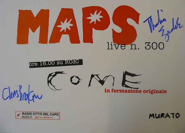 I festeggiamenti, però, sono iniziati nel pomeriggio nei nostri studi: il live che Chris Brokaw e Thalia Zedek hanno fatto nei nostri studi, infatti, è il 300° di Maps. La band ha da poco concluso il tour europeo di presentazione della ristampa del debutto Eleven:Eleven, considerato da critici e musicisti una vera e propria pietra miliare del rock (come allora si diceva) alternativo statunitense degli anni ’90. Nell’intervista Chris e Thalia rievocano quegli anni, raccontano di come le major hanno cercato di sedurli e suonano tre pezzi in acustico, uno dei quali è l’ultima canzone registrata con la prima formazione dei Come, proprio quella che giovedì sera ha regalato a Murato l’ultimo grande concerto della stagione.