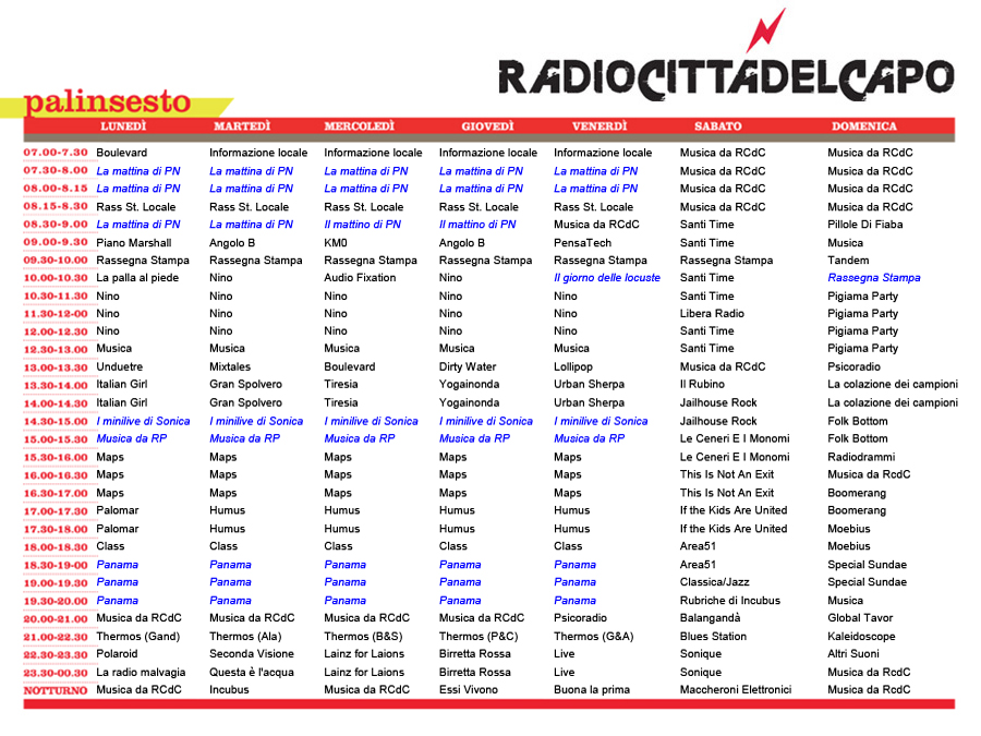 Venerdì: alle 9 PensaTech, a cura di Damiana Aguiari e Elisabetta Tola e Marco Boscolo di Formica Blu. Alle 10 Il Giorno delle Locuste, trasmissione in Network di Giammarco Bachi e Andrea Di Stefano. Alle 13 Lollipop, appuntamenti per il fine settimana scelti da Laura Govoni. Subito dopo Urban Sherpa, per aprire gli occhi anche sulle città d’Europa. Thermos al femminile, novità muiscali a cura di AliceMalice e GermanaRama. Live insieme a Nevio Bencivenni dalle 22.30 alle 00.30 e poi Buona la prima, notturna di Kamajidj.