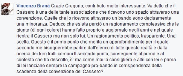 Al momento non ci sono dichiarazioni ufficiali, ma in un post su facebook Vicenzo Branà, presidente del circolo Arcigay, dice la sua. Rispondendo ad un utente del social network, Branà si chiede, tra l’altro, “come mai la consigliera e altri con lei e prima di lei lanciano sempre la campagna pro-bando in corrispondenza della scadenza della convenzione del Cassero?”