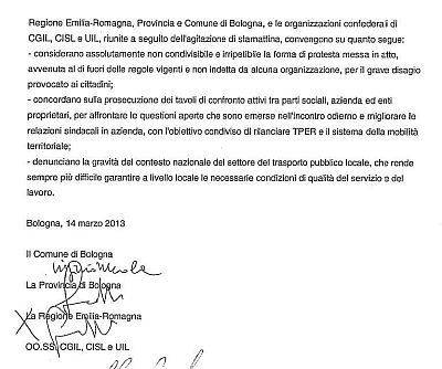 14 mar. – Una lunga riunione, più di quattro ore, in una giornata che si è aperta con il caos provocato dallo sciopero improvviso degli autisti Tper. Tutti i sindacati hanno firmato il verbale d’incontro davanti al Prefetto Angelo Tranfaglia che però rimanda il merito della discussione sulle cause che hanno provocato lo stop a lunedì 18 marzo. Nel verbale d’incontro il sindacato di base Usb ha specificato di non condividere il primo punto dove si dà “una valutazione negativa della protesta odierna”. In ogni caso una schiarita sulle relazioni sindacati/ azienda con il verbale che afferma che ci sono situazioni che hanno creato grande disagio ai lavoratori sfociato nell’agitazione odierna. Si attende di capire se ci saranno sanzioni per gli autisti ribelli.