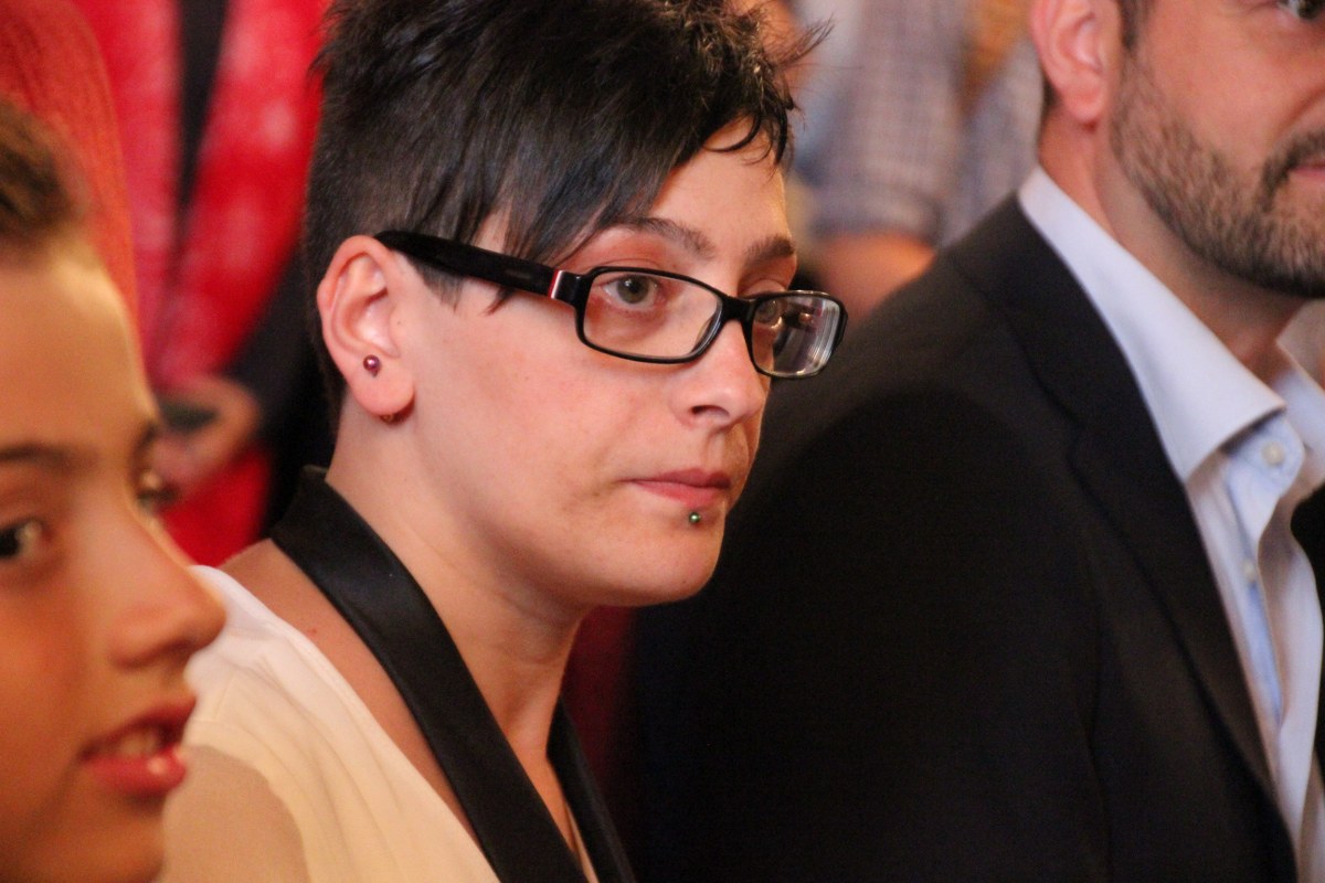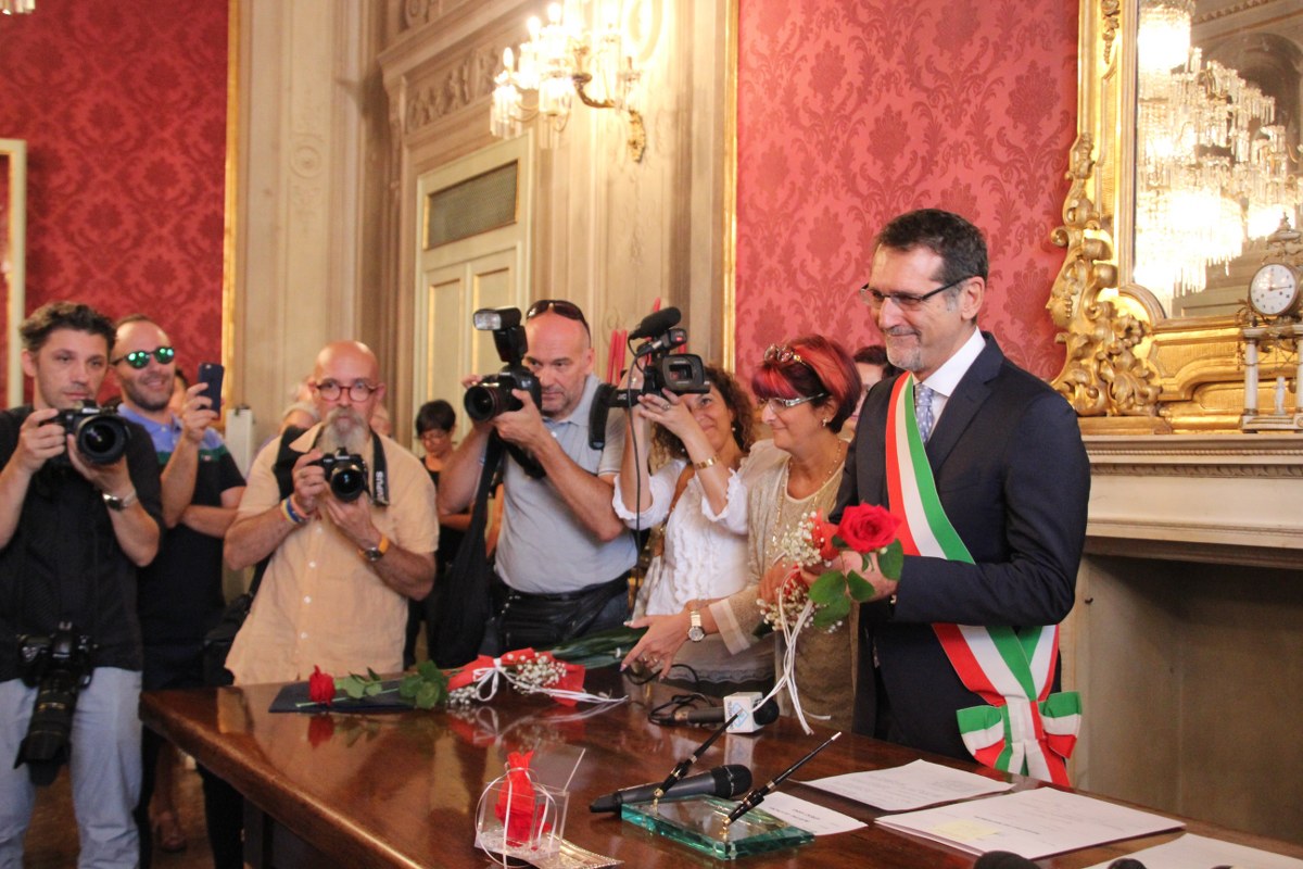 Anna è vestita con una camicetta bianca senza collo, cravatta a nodo largo, pantalone nero e scarpa casual. Eleonora ha un vestito a fantasia bianco e nero, coperto da una camicetta nera trasparente e con un fiore bianco sulla spalla. Il sindaco Virginio Merola apre la cerimonia dicendo: “Non posso dare buoni consigli perché ho già dato cattivi esempi, essendo risposato dopo un divorzio. Ma quello che mi sento di dirvi è questo: la vita insieme può essere anche faticosa, si assumono impegni”. E l’esempio di Merola arriva dal mondo degli scacchi: “Sapete meglio di me che per saltare gli ostacoli nella scacchiera c’è solo il cavallo: gli altri pezzi fanno muro contro muro. Voi oggi avete fatto la mossa del cavallo ed è il vostro amore. Usatelo al meglio e siate davvero felici”.