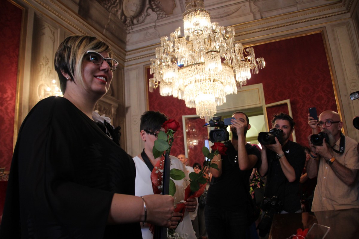 La presenza della stampa infatti è stata, come era prevedibile, ingombrante e a tratti invadente, ma Anna ed Eleonora non ne sono turbate. “Non c’è nessun problema a vivere l’amore liberamente, con la stampa. Anzi vogliamo urlarlo al mondo intero” commenta Anna ai microfoni. “Se ne parlava da sempre” commenta una delle invitate. “Sono stupende. Si è aspettato troppo tempo, dovevamo unificarci al resto del mondo, non possiamo essere sempre gli ultimi” le fa eco un’altra amica delle spose.