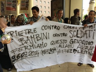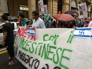 Davanti al corteo una camionetta del reparto mobile della Questura e in coda una del battaglione dei Carabinieri. Sotto i portici i curiosi e le persone intente allo shopping. Tra loro, all’altezza di via Milazzo, una coppia di ragazze, al passaggio del corteo commenta: “Bastardi israeliani, quello che stanno facendo a Gaza è schifoso…” Viene interrotta da un’altra passante, una ragazza sulla trentina, con una chitarra sulle spalle. E’ israeliana: “Perché dici ‘israeliani bastardi’? Sono i governi che fanno la guerra, mica le persone. Pensi che sia facile essere israeliani in questo momento? Guarda che la realtà è più complessa” dice guardano il corteo sfilare. E si allontana tra lo stupore delle altre due.