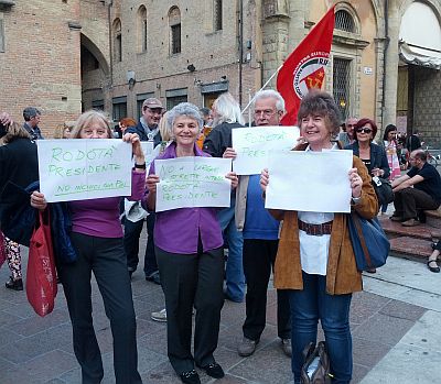 18 apr.- Un presidio autoconvocato in tempi brevissimi per chiedere che i voti del Pd convergano su Stefano Rodotà, il giurista che è anche il presidente onorario del comitato Articolo33 che ha promosso il referendum consultivo sui finanziamenti comunali alle scuole dell’infanzia private. In piazza, oltre ai referendari, anche il comitato Acqua bene comune, militanti di Sel e Rifondazione, il filosofo Stefano Bonaga, Franco Grillini e diversi elettori democratici delusi come quelli che ritraiamo in questa foto.