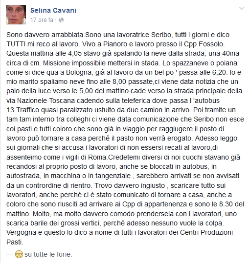 Oggi è stato anche il giorno dello sfogo dei lavoratori Seribo che non ci stanno a passare per assenteisti. Qualcuno di loro ha affidato a Facebook la propria spiegazione su quello che è accaduto. “Mentre eravamo in macchina o in bus per arrivare al lavoro ci è stato detto di tornare a casa” è la sintesi di messagi come questo