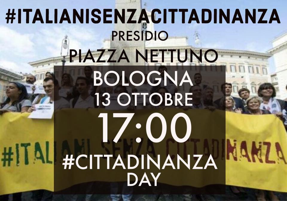 “Il 13 ottobre a Roma – si legge sull’evento facebook – ci sarà una manifestazione per far pressione sul senato affinché passino lo #iussolitemperato e lo #iusculturae, ricordando lo storico giorno, il 13 ottobre 2015, quando alla Camera si votò si per la riforma della cittadinanza. Anche noi ‘Italiani Senza Cittadinanza’ di Bologna abbiamo deciso di scendere in piazza per sostenere la causa e dimostrare la sensibilità dei cittadini su questo tema. In nome dei valori di solidarietà ed eguaglianza vi invitiamo al presidio che ci sarà in piazza Nettuno alle 17. Vi è un’unica richiesta: no colori politici/partitici/di associazioni (quindi niente bandiere e loghi). Il nostro obiettivo è quello di vedere in piazza solo cittadini, che in quanto tali manifestano per la partità di diritti anche per le seconde e terze generazioni di immigrati. Ci vediamo venerdì in piazza, per la #RIFORMACITTADINANZASUBITO!”