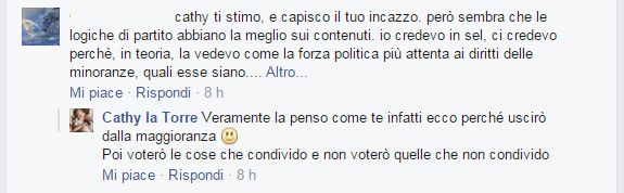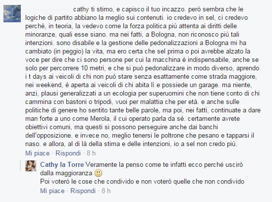 Bologna, 15 ott. – La capogruppo di Sel in Comune a Bologna, Cathy La Torre, ha deciso di abbandonare la maggioranza di centrosinistra a Palazzo D’Accursio.