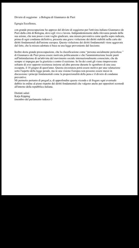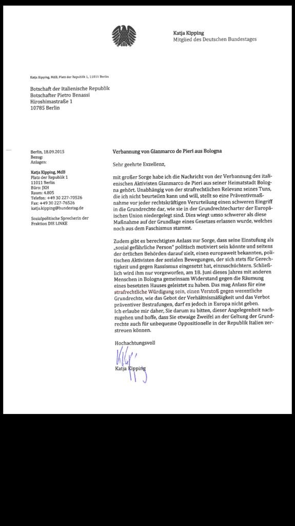 Bologna 30 set.- Lei è la leader della Linke, l’unione dei partiti della sinistra tedeschi che alle ultime elezioni federali è diventata la terza forza del paese. Katja Kipping ha scritto una lettera all’ambasciatore italiano a Berlino sul caso di Gianmarco De Pieri, l’attivista del Tpo che a inizio settembre era stato raggiunto dalla misura del divieto di dimora nell’ambito dei tafferugli scoppiati durante lo sgombero di villa Adelante lo scorso giugno e la scorsa settimana è stato posto agli arresti domiciliari per un’altra inchiesta della Procura di Bologna.