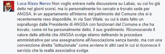 Scrive invece Chiara Pazzaglia dell’Acli Bologna: “Tutta la solidarietà vista oggi per Labas, persino da consiglieri comunali e dipendenti pubblici, che dovrebbero essere i primi difensori della legalità, la vorrei vedere per tutte quelle associazioni, compresa quella per cui lavoro io, che si fanno un paiolo quadrato ogni giorno per fare le stesse identiche cose, altrettanto meritorie e forse più, ma non appropriandosi illegalmente e gratuitamente di spazi di qualcun altro, non occupando e manifestando, ma lottando ogni giorno per far quadrare i conti, per avere sempre tutto a norma, annegando nella burocrazia a tutti i livelli (censimenti locali, regionali, nazionali, obblighi, iscrizioni ad albi, requisiti da manetenere)”.