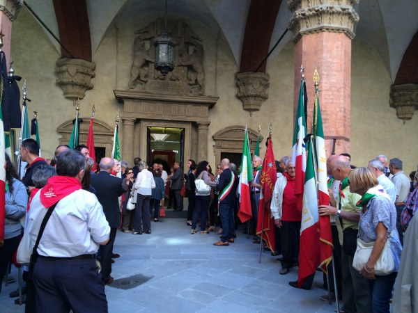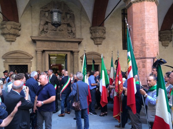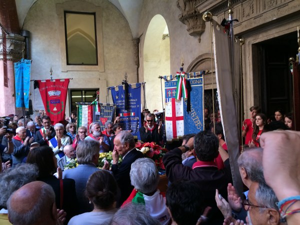 Le bandiere delle sezioni Anpi della provincia, i labari con le medaglie delle sezioni provinciali di Bologna e di Macerata, i gonfaloni di molti comuni della provincia, tutti listati a lutto. Nel cortile d’onore di Palazzo d’Accursio, prende per primo la parola il sindaco Merola, che ripercorre a sommi capi la biografia di Michelini. “La storia di William – ha detto il sindaco – è la storia di una generazione, un giovane del popolo che in maniera determinata e coraggiosa ha deciso di schierarsi apertamente contro il nazifascismo, e successivamente nel dopoguerra ha tenuto fede ai suoi ideali, prima nel suo partito e poi nell’Anpi, con un obbiettivo ben chiaro: difendere e tramandare i valori della Resistenza”.
