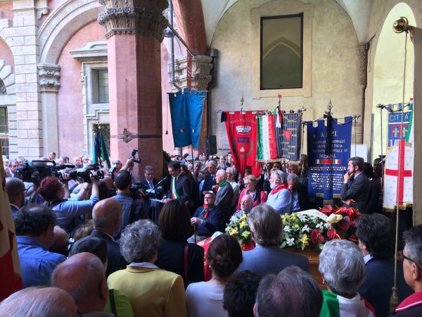 Ad ascoltare le orazioni funebri tanti volti noti della politica cittadina, assessori comunali, provinciali e regionali; i segretari delle sezioni Anpi della provincia; il Rettore Ivano Dionigi; l’ultimo segretario del Partito Comunista Italiano Achille Occhetto. E tanti cittadini, vecchi e giovani, quelli che in questi ultimi anni hanno incontrato e collaborato con l’Anpi di Michelini. “Aprire l’associazione ai giovani era il suo obiettivo” hanno ricordato in molti. Volti commossi, molte le lacrime e i nodi in gola che impediscono di parlare fino a quando, sul finire della breve cerimonia, accompagnati da una chitarra, si sciolgono nel più partigiano dei canti e sotto le volte di palazzo d’Accursio rimbalza “Bella ciao”.