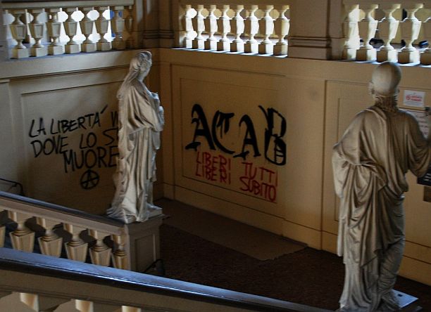 Bologna, 20 mag. – “L’aula odia, la Polizia non può sequestrare“. E ancora: “Meglio teppisti che infami”. Sono due delle tante scritte apparse sui muri della Facoltà di Scienze politiche dell’Università di Bologna, probabilmente tra venerdì e sabato notte quando nel cortile di Palazzo Hercolani è stata organizzata una festa non autorizzata. Imbrattata con vernice nera anche una delle statue del piano terra. Le scritte, che hanno avuto vita breve visto che già questa mattina degli operai hanno ripulito i muri, fanno riferimento al sequestro dell’aula C, storica auletta autogestita sigillata dallo scorso 11 maggio su disposizione del Tribunale del Riesame.