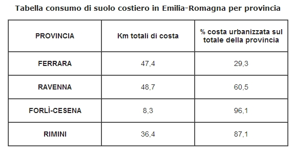 Lo studio di Legambiente ha analizzato la costa emiliano-romagnola in un arco di tempo che va dal 1988 al 2011. Su un totale di 141 chilometri di costa – da Gorino, al confine con il Veneto, a Cattolica, al confine con le Marche – 82 chilometri (pari a ben il 59%) sono stati trasformati a usi urbani, infrastrutture portuali e industriali. Più precisamente 30 chilometri sono occupati da tessuti urbani densi, 39 chilometri sono interessati da un edificato meno denso, con carattere più rurale in trasformazione e 13 chilometri sono occupati da infrastrutture portuali e industriali. Si “salvano” complessivamente solo 42 chilometri di paesaggi costieri ancora con caratteri naturali, cioè tratti di costa completamente liberi dal cemento, mentre i tratti costieri con paesaggi agricoli si sono ridotti a soli 17 chilometri, un dato allarmante rispetto all’identità e alla storia della costa emiliano-romagnola.