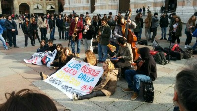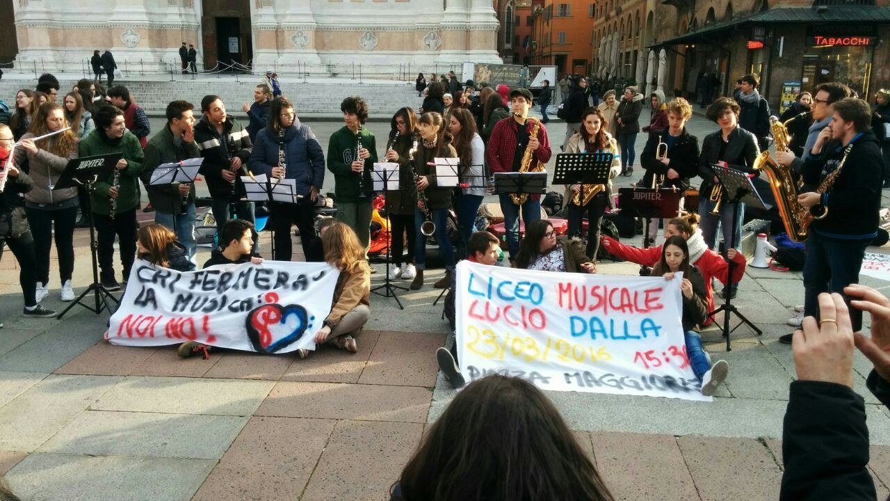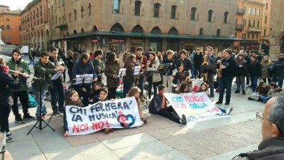 Bologna, 23 mar. – Si è tenuto a Bologna un flash mob organizzato dagli studenti e dagli insegnanti del liceo musicale “Lucio Dalla”. È una protesta nazionale contro uno degli aspetti più dibattuti della «Buona scuola», la riforma dell’Istruzione decisa del Governo. Oggi hanno protestato 120 licei musicali e coreutici italiani perché saranno costretti, da settembre, ad affrontare un radicale cambiamento: la sostituzione totale dei professori di indirizzo.