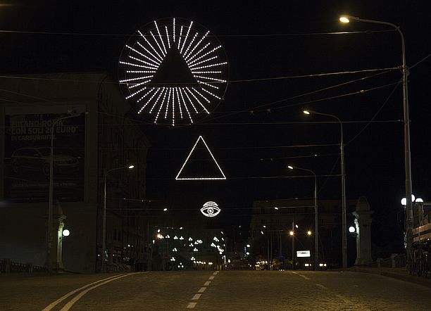 Bologna, 17 dic. – Cinque luminarie, sospese su ponte Matteotti. Rappresentano un occhio, un triangolo e un circolo di raggi. I primi due sono ripetuti. Guardandole, come tutte le luminarie, si sovrappongono e si incrociano dando vita a nuove forme. Quelle in questione, però, se viste da due punti precisi (all’altezza del civico 6 di via Matteotti 6 e da via Indipendenza, all’altezza della fermata degli autobus davanti all’Autostazione) si sovrappongono a formare un simbolo massonico.