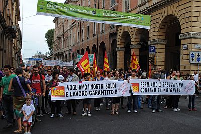 Poi i lavoratori comunali che invocavano: “Ridateci almeno le mutande”, le dade dei “nidi comunali in lutto”, gli attivisti di Asia che hanno denunciato la “truffa dell’housing sociale”, il coordinamento migranti, il comitato per l’acqua bene comune, i lavoratori del trasporto pubblico contrari alle privatizzazioni e alcune delegazioni da Piacenza, Parma, Modena e Ferrara. In fondo gli anarchici dell’Usi, con lo striscione nero: “Loro le forbici, noi il sasso”.