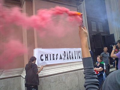 Una corteo “via crisis“, come l’ha chiamato il leader bolognese di Usb Massimo Betti, che ha anche portato al lancio di un paio di grossi petardi di fronte alla sede d ella Banca d’Italia in via Cavour e all’affissione di uno striscione davanti alla cattedrale di San Pietro: “Chiesa: paga l’Ici”