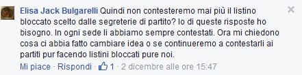 A polemizzare anche la senatrice Elisa Bulgarelli, eletta in regione. Sulla sua pagina facebook, rispondendo agli attivisti che le chiedevano un parere su Bugani, Bulgarelli ha posto più volte la stessa domanda. Visto che a Bologna non ci saranno primarie, ha detto in sintesi la senatrice, il movimento potrà ancora contestare i partiti che imporranno i loro candidati col listino bloccato?