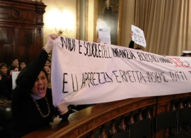 In seguito le lavoratrici, sotto le insegne di AdiScuola, Sgb e Cub scuola, sono riuscite a entrare in consiglio comunale usando l’ascensore anziché passare per lo scalone. Dopo aver mostrato come prassi i documenti, si sono sedute nei banchi dedicati al pubblico, poi hanno srotolato uno striscione e gridato “Vergogna! Democrazia!”, contestando al Comune la decisione di applicare in maniera più restrittiva le norme sull’indizione delle assemblee sindacali, di fatto restringendo le possibilità di convocazione per le sigle meno rappresentate o non firmatarie dei contratti.