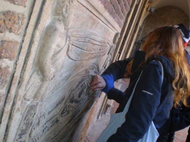 Qui sotto due foto di una visita in città con non vedenti. Le strutture architettoniche si possono “vedere” anche attraverso il tatto.