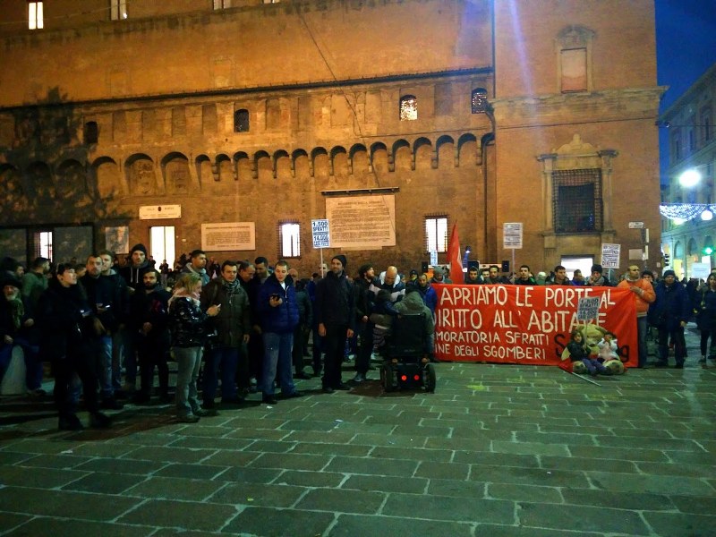 Il corteo, partito da piazza dell’Unità, è arrivato in piazza Nettuno passando di fronte all’ex Telecom sgomberato. Alcune famiglie in corteo hanno conosciuto Social Log solo da alcuni mesi. “Siamo in quattro in famiglia, mi sta ospitando mio fratello ma loro sono già in sei e in dieci con un bagno solo è dura” racconta una donna che sperava di poter entrare nell’occupazione in via Agucchi, finita con uno sgombero con intervento lampo da parte delle forze dell’ordine e tre giorni di presidio sul tetto.